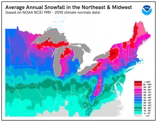 National Oceanic and Atmospheric Administration (NOAA) National Center for Environmental Information (NCEI) 30-year climate normal snowfall over the northeast and Midwest United States (U.S.). Graphic was created by the Midwestern Regional Climate Center and can be accessed here: https://www.weather.gov/lot/snowclimatology. Accessed on 23 August 2024.