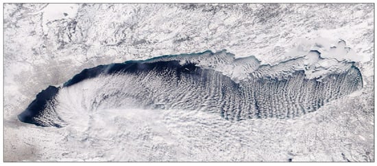 Prevailing low-level winds may also align parallel to a lake’s minor axis, which results in multiple less-intense linear bands of convection 5–8 km apart and stretching up to 50 km [7,27]. Because fetch significantly decreases due to the elliptical geometry of the lakes, energy fluxes and solenoidal forcing are suppressed, resulting in lower snowfall totals. However, because of the multiple band configuration, the coverage area is much larger compared to major axis bands, which tend to be more localized. Boundary layer convective rolls tend to dominate during minor axis LES events, which manifest as “cloud streets” on satellite imagery (Figure 2) [13,28,29]. Because convection is primarily driven by thermal instability, these rolls tend to align parallel to mean CIBL shear vectors [30,31]. Over the Great Lakes, minor axis LES band events are most frequently observed over the eastern Michigan Coast, southern Lake Superior coast, northeastern Ohio, northwestern Pennsylvania, and southwestern and western New York (Figure 1) [21].