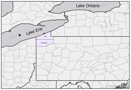 Two counties located in NW PA, along the southern lee of Lake Erie, were selected to pull LES cases from: Erie and Crawford (Figure 3). LES cases from these counties were extracted from the NOAA Severe Storms Database into a data repository. In some instances, the episodes from Erie and Crawford counties overlapped with one another (i.e., a singular LES event impacted both counties). Such occurrences were identified using the “episode ID” within the database. For these situations, the episodes were treated as single cases, and the earliest start date and latest end date were used for the repository. Using this time frame ensured that the LES event was captured in its entirety. For this work, the 2006–2020 period of record for each county was assessed. This period of record encompasses the years during which all assessed attributes for each lake effect case were accurately documented. For each case, the following attributes were recorded: