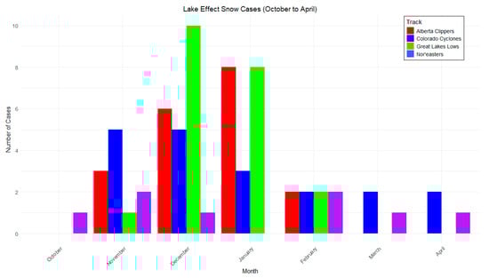 From 2006–2020, 79 total LES cases were extracted from the NOAA Severe Storms Database. Of these 79 cases, 8 (10.13%) cyclones were classified as NEs, 21 (26.58%) cyclones were classified as GLs, and 19 (24.04%) cyclones were classified as ACs and COs. Additionally, six (7.6%) of the cases were classified as “other”, and another six (7.6%) were “indeterminate”. The majority (66.7%) of “other” cases were characterized by synoptic low-pressure systems that formed in the near vicinity of the Hudson Bay (referred to as “Hudson Lows” by [46]). “Indeterminate” cases primarily featured the presence of multiple cyclones in and around the Great Lakes basin, which clouded the authors’ ability to attribute the surface wind fields to a single system. There were also “indeterminate” cases that featured the absence of a cyclone entirely, in which the synoptic-scale wind fields were northwesterly across much of the Great Lakes basin. Figure 5 presents the seasonality of the LES events based on cyclone track (“other” and “indeterminate” cases were not included). As expected, most cases occurred during the early winter season (December and January), followed by the month of November. From there, the number of cases dropped off, with only a maximum of two cases per cyclone track occurring during any of the other months assessed (Figure 5). This can likely be attributed to Lake Erie’s shallow depth, which results in significantly higher ice coverage compared to the rest of the Great Lakes, particularly in the late winter.