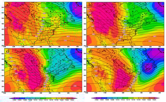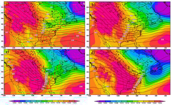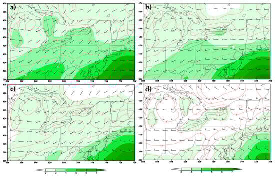 Upper-level composites for Alberta Clipper cases exhibited a low 500 mb geopotential height anomaly centered over the northern Hudson Bay, along with a primarily zonal structure over the Great Lakes Basin and a subtle shortwave trough located upstream (Figure 8a). The shortwave trough coincided with a weak (1016–1018 mb) MSLP minimum over the northern Great Lakes basin 48 h before LES initiation. As time progressed, this MSLP minimum strengthened, featuring 6–8 mb pressure drops. Concurrently, the shortwave trough began to dig and amplify, which provided additional synoptic vertical forcing (Figure 8b). This process of the upper and low-level features feeding each other continued throughout the duration of the LES event (Figure 8c,d), exhibiting characteristics described by the Sutcliffe–Petterssen self-development theorem [51].