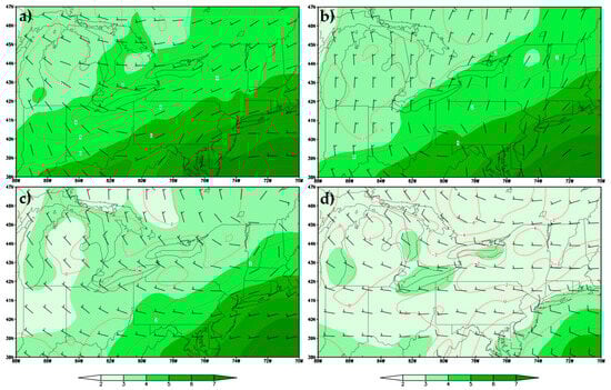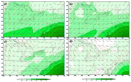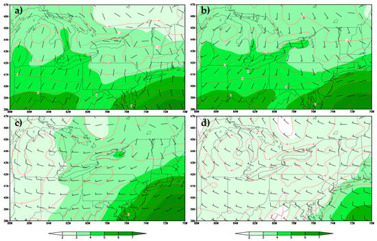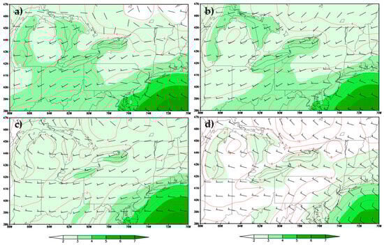 Surface winds featured an atypical evolution up to the onset of LES. Forty-eight hours out, winds were primarily westerly (Figure 13a) due to an unrelated synoptic MSLP minimum centered over the eastern Hudson Bay (Figure 12a). Twenty-four hours later, the Nor’easter began exhibiting more influence on the surface winds, which resulted in a primarily northerly profile due to Lake Erie being on the western edge of the cyclone (Figure 13b). As the Nor’easter progressed further north, winds backed northwesterly (Figure 13c,d), as now Lake Erie was on the cyclone’s southwestern edge.