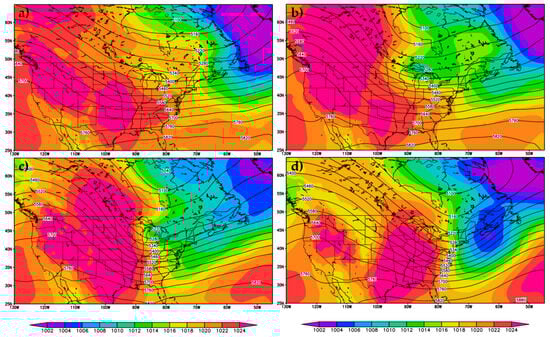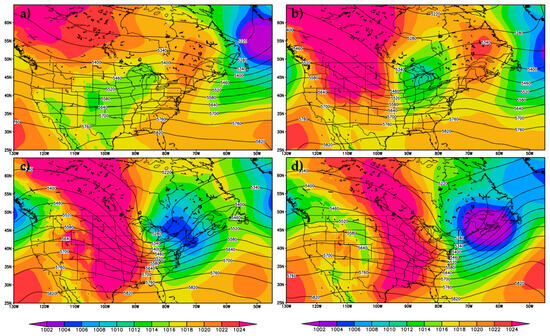 Synoptic composites for Nor’easters of 500 mb geopotential heights (countered lines; m) and MSLP (shaded; mb) for t—48 h (a), t—24 h (b), t (c), and t + 24 h (d), where t represents the onset of LES.