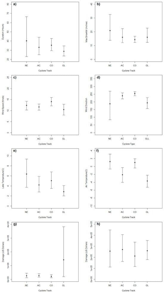 In addition to the synoptic composite map analysis, we compared the LES characteristics (duration, property damage, max snowfall, initial LST, initial air temperature, and initial wind speed/direction) associated with each cyclone track (AC, CO, NE, GL). Bootstrapping, a non-parametric technique, was utilized to complete this analysis. This statistical technique resamples the data, with replacement, in order to generate empirical distributions of a statistic of interest (e.g., mean, standard deviation) [50]. With these resampled distributions, confidence intervals were derived, allowing for the identification of any statistically significant differences in the LES characteristics between cyclone types.