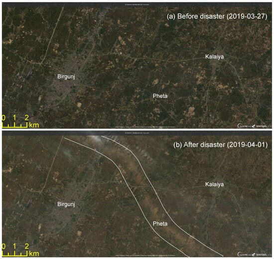 Footprint of damage due to the 31 March 2019 storm over the Parsa and Bara Districts of the Central Nepal Himalaya foothills. Images from the European Space Agency (ESA)’s Sentinel satellite (a) before the disaster (27 March 2019) and (b) after the disaster (1 April 2019). The appearance of a narrow strip of soil color running northwest–southeast in the middle of (b) and not seen in (a) resembles the tornado tracks seen in other parts of the world.