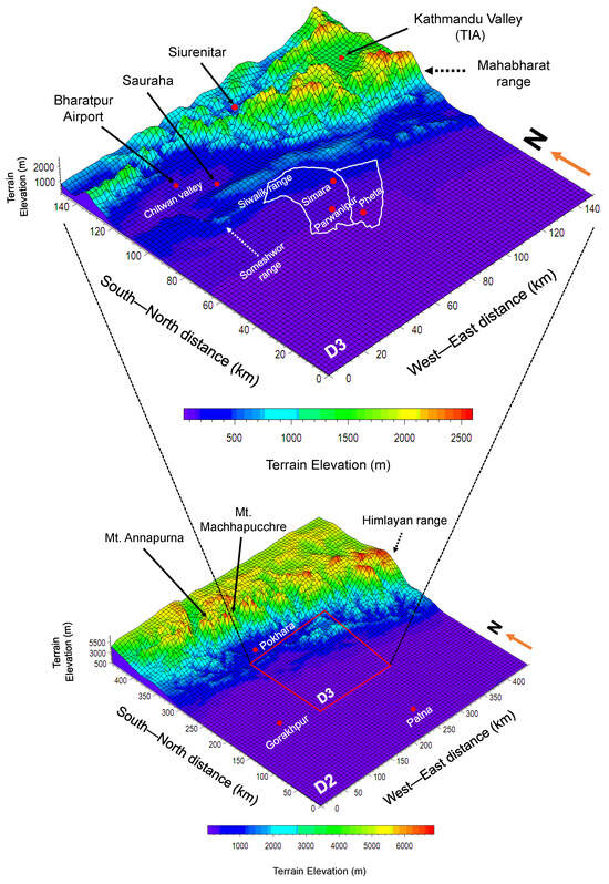 Three-dimensional terrain structure of the area in and around the storm-hit area enclosed by the fine domain (D2). The inset shows the same area enclosed by the finest domain (D3). Important places are indicated in the figure. The left and right polygons in the central area of the inset indicate Parsa and Bara Districts, which were severely hit by the 31 March 2019 storm (see pictures in Figure 1).