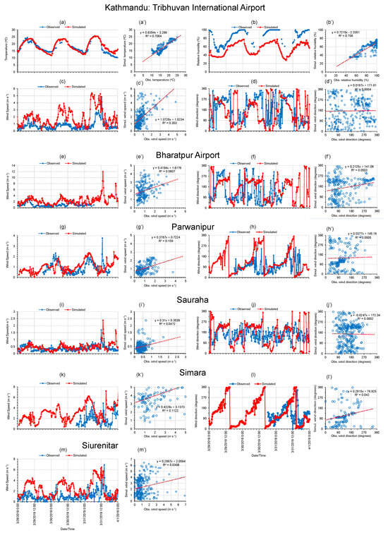 Comparison of three-day WRF simulated and observed (a–m) diurnal variation of temperature, relative humidity, wind speed, and wind direction and (a’–m’) the corresponding scatter plots for different ground stations. Temperature and relative humidity comparisons are presented only for Kathmandu station. The name of the stations are noted in the figure.