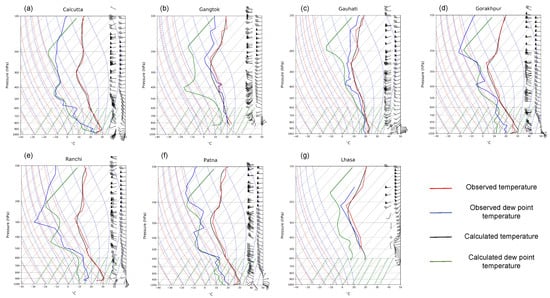 To determine whether the upper airflow was appropriately captured by our WRF simulations, we explored the regional sounding data for the Calcutta, Gangtok, Gauhati, Gorakhpur, Patna, and Ranchi stations in India and the Lhasa station in Tibet/China (see Figure 4 for locations) for 0000 UTC (0545 LST) 31 March 2019.