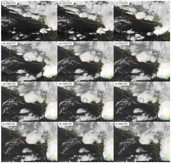 Figure 7 illustrates the temporal evolution of clouds as captured by the Himawari-8 satellite from 0940 UTC 31 March 2019 to 1500 UTC 31 March 2019. The red circle in Figure 7 indicates the Parsa–Bara area, where the tornado passed over from 1345 UTC to 1445 UTC. Figure 7a suggests that a cloud cluster (the blue circle) with a size of about 160 km long in the west–east direction and 50 km wide in the south–north direction developed by 0940 UTC over the southern foothills of the Annapurna–Machhapuchhre Himalaya Range in the Gandaki Zone of central Nepal. The bright spots in the cloud cluster that are apparent on close inspection indicate the presence of deep cumulus convection. The satellite images from 0940 UTC to 1500 UTC in Figure 7a–l show that the cloud system accompanying deep convective cells moved southeastward and reached the Parsa–Bara area (indicated by the red circle) around 1315 UTC.