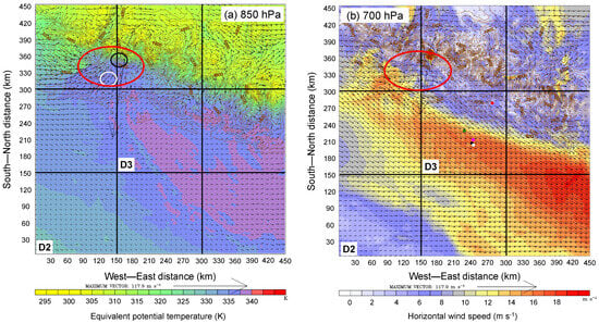 Horizontal wind vectors with (a) equivalent-potential temperature (K) at 850 hPa and (b) horizontal wind velocity (m s−1) at 700 hPa in D2 on 1015 UTC (1600 LST). The location of the red ellipse in (a,b) roughly corresponds to that of the blue circle in Figure 7b.