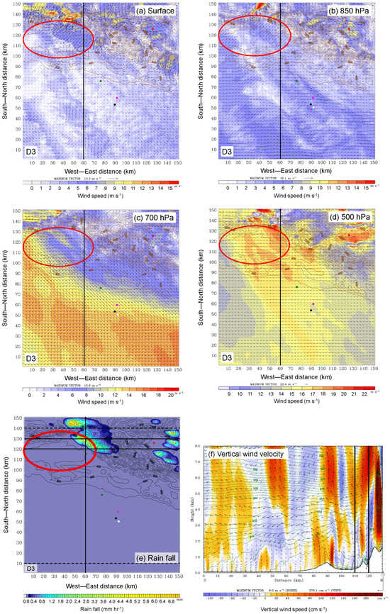 Horizontal wind vectors and wind velocity at 1230 UTC (1815LST) in D3: (a) surface, (b) 850, (c) 700, and (d) 500 hPa; (e) rain fall (mm h−1), and (f) vertical cross-section of wind and vertical wind velocity along SN line through x = 60 km from [y] = 0 to 130 km (i.e., y = 10 to 140 km in D3). In (a–e), the color dots represent specific locations: green for the center of D3, red for Kathmandu, and pink, white, and black for specific tornado-damaged places.