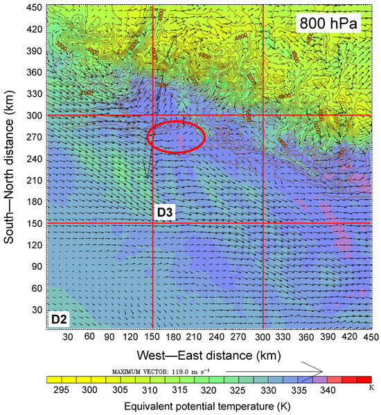 Wind vectors and equivalent potential temperature at 800 hPa in D2 at 1230 UTC (1815 LST). Domain D3 is shown at the center. The red-circled area corresponds to the same areas of D3 in Figure 9. The thin solid contours indicate terrain heights, with an interval of 400 m.