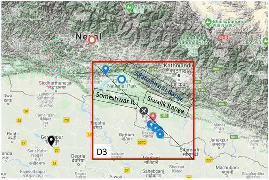 WRF version 3.8.1 was configured for 72 h runs to simulate the extreme weather event of 31 March 2019 over the Parsa–Bara area using a triply nested two-way interacting domain. We used the finest domain (D3), fine domain (D2), and coarse domain (D1), each consisting of 151 horizontal grid points with respective resolutions of 1, 3, and 9 km and 37 vertical levels. All three simulation domains were centered at N and E (the purple star in Figure 4).