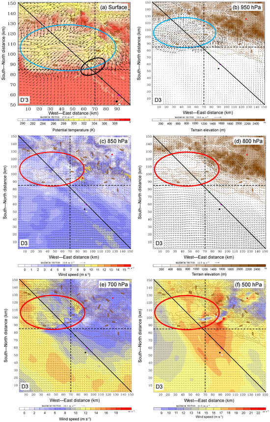 Figure 12a–f shows the spatial distribution of simulated horizontal wind vectors at different heights in domain D3 at 1400 UTC 31 March 2019 at (a) the surface level with potential temperature (color shaded), (b) 950 hPa with terrain (color shaded), (c) 850 hPa with horizontal wind speed (color shaded), (d) 800 hPa, (e) 700 hPa with horizontal wind speed (color shaded), and (f) 500 hPa with horizontal wind speed (color shaded).