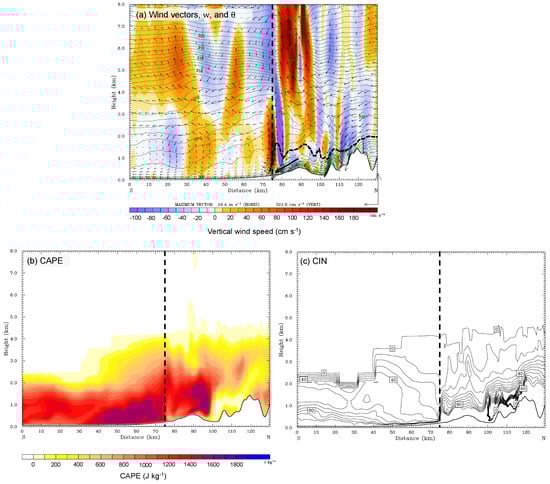 Figure 13b indicates a large CAPE at 1600 J kg−1 in the lower troposphere below about 1.5 km AGL over the north–south distance of [y] = 40 to 75 km, while Figure 13c shows that a relatively large CIN at about 80 J kg−1 exists only in the lowest thin layer, with its depth being less than 100 m next to the ground over the same distance [y]. It can be noted that the time of Figure 13 is 1400 UTC (1945 LST), indicating that the local boundary layer condition was in a stage of transition from daytime to nighttime and that cooling of the ground surface had started. These conditions favor maintaining mesocyclones relevant to tornadoes (as shown in numerical experiments in, e.g., [] and summarized in [], as well as by the observational study in []). The flat area is the intrusion of the cold outflow. Figure 13a further indicates that the air mass with large CAPE value was lifted above 1 km AGL at the cold outflow front ([y] = about 75 km) and that this lifted air mass contributed to enhancing the updraft at the front.