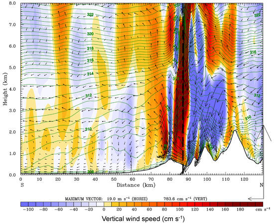 Figure 15 shows a vertical cross-section of the vertical wind velocity wat 1400 UTC (color shaded with warm and cold colors for updraft and downdraft, respectively) and potential temperature (green contours) along a south–north line passing through the center of the mesocyclone (the yellow disk at west–east distance x = 90 km in Figure 14). Figure 15 shows that strong updrafts existed around the center of the mesocyclone at a south–north distance of [y] = 87 km, which corresponds to y = 97 km in Figure 14a, and that the vertical depth of the updraft layer exceeded 8 km.