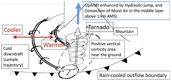 In the above, we have adapted the discussions by Rotunno et al. [], Markowski and Richardson [], Davies-Jones [], and others. Their work suggests that strong vertical vorticity for tornadogenesis mostly has its origin in both streamwise and crosswise horizontal vorticity. In this process, horizontal vorticity accumulates at the point of tornadogenesis due to rain-cooled air descending near to the ground surface. Then, the horizontal vorticity is changed to (positive) vertical vorticity by tilting. Finally, upward stretching of the vortex by convective updrafts amplifies the positive vertical vorticity to form a tornado.
