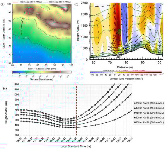Simulated trajectories passing over the intersection of the lines oriented south–north through x = 70 km and west–east through y = 85 km, i.e., the two dashed lines in Figure 17 at 1400 UTC (1945 LST). The intersection is supposed as the place of the tornadogenesis, which is schematically shown by the “T” in Figure 18. The trajectory calculation was performed from 1350 UTC (1935 LST) to 1410 UTC (1955 LST). The details of the calculation are described in the text. The starting heights of the trajectory calculations at 1400 UTC (1945 LST) were set every 50 m from 100 m AGL (350 AMSL) to 300 m AGL (550 m AMSL). (a) Horizontal projection of the two trajectories at the lowest (100 m AGL) and highest (300 m) starting heights; (b) vertical projection of the same trajectories as in (a); and (c) time records of the heights of the simulated trajectories. The red dashed line shows the starting time of 1400 UTC (1945 LST) for the backward and forward calculations, demonstrating that each trajectory is near its lowest height at around 1400 UTC (1945 LST).