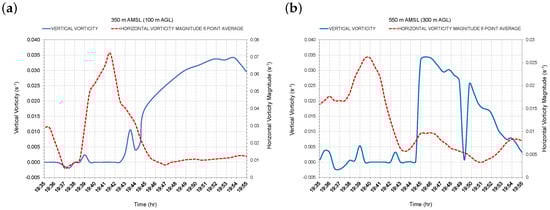 Figure 20a shows temporal changes in the vertical vorticity and horizontal vorticity magnitude along the trajectory passing point “T” at a height of 100 m AGL at 1400 UTC, while Figure 20b shows the same as Figure 20a for a height of 300 m AGL. The terms , , and refer to the x, y, and z components of the vorticity vector, respectively, and were calculated with the expressions shown below.