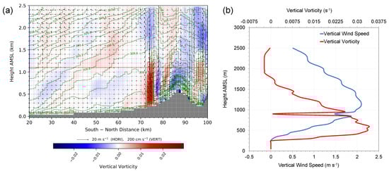 Figure 20a,b indicates the following: (1) as the air parcel on each trajectory descends after 1350 UTC (shown in Figure 19c), the horizontal vorticity magnitude first increases until reaching its peak value around 1355 UTC–1356 UTC, then decreases; (2) the vertical component of the vorticity is nearly zero at first, then rapidly increases with positive value after around 1358–1400 UTC, when the trajectories reach their lowest heights (shown in Figure 19c). As described in Rotunno et al. [] and other references, these results show that the air parcels descending towards the point of tornado formation first obtain horizontal vorticities, then the horizontal vorticities are converted to the positive (i.e., cyclonic) vertical vorticity by upward tilting of the vortex line around the lowest height of the trajectory at about 1358 UTC–1400 UTC. Figure 20a,b indicates that the cyclonic vertical vorticity further increased during upward motion of the air parcel after 1400 UTC (see Figure 19b,c). This enhanced vertical vorticity can be seen in Figure 21a, which presents the south–north vertical cross-section through x = 70 km of the simulated vertical vorticity (color shaded) at 1400 UTC. The column of large positive vertical vorticity extending from the ground to about 1 km AMSL around [y] = 75 km (Figure 21a) is due to upward stretching of the vortex line, as suggested in Figure 19b. Figure 21b presents vertical profiles of the vertical wind velocity (blue) and vertical vorticity (red) at [y] = 75 km at 1400 UTC, suggesting that the positive vertical vorticity is closely correlated with the updraft velocity profile, i.e., the maximum updraft locates at about z = 1.1 km AMSL, while the maximum positive vertical vorticity appears below this height. Together, these results indicate that the positive vertical vorticity () was amplified by upward stretching of the vortex line in the positive vertical gradient layer of the updraft, i.e., . The strong updraft found in Figure 21a,b is associated with lee jumping of the cold outflow over the mountain and enhanced lifting of the high-CAPE air mass ahead of the front under the downshear-propagating density current (cold outflow) condition, as discussed in Section 4.3.2.