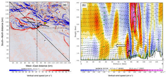 Figure 23a suggests that the air mass over the southern plain area was lifted at the leading edge of the cold outflow, then possibly incorporated into the atmosphere behind the front. In Figure 23a, the short dashed arrow originating from the plain area illustrates a plain view of a possible sample trajectory reaching the “T” point of tornadogenesis. To understand this possible behavior of the warmer plain air, Figure 23b shows a vertical cross-section oriented south–north through x = 70 km in Figure 23a of the vertical wind velocity (color shaded) and potential temperature (green contours) with the front-relative wind vectors. Figure 23b suggests that an air mass below about 2 km AGL over the plain area was lifted by the updrafts at the front, then transported downward by the rain-cooled downdrafts to merge into the cold outflow body. Following this, it can be inferred that air parcels originating from the plain area ahead of the front could reach point “T” in Figure 18. The dashed arrow in Figure 23b displays a vertical view of the same possible air parcel trajectory reaching the point of the tornadogenesis. As discussed in Markowski and Richardson [], and Rotunno et al. [], we can consider that the air parcels also acquired substantial streamwise and crosswise horizontal vorticity during the above process prior to reaching the “T” point and undergoing conversion to vertical vorticity.