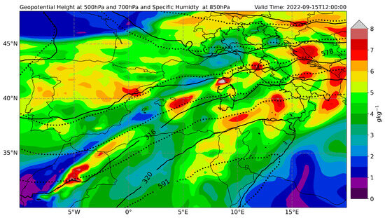 At 12 UTC on 15 September 2022, the geopotential height isolines at 500 and 700 hPa were almost perpendicular to the Apennine Mountains (Figure 3). This shows that there is a predominant zonal flow pattern (Figure 4). High specific humidity values at 850 hPa accompany this zonal flow, suggesting an abundant moisture supply. The configuration of these humidity values formed a long, narrow filament, a structure consistent with an atmospheric river, which appears to originate from approximately 5°East and 35°North, extending northeastward across the Mediterranean and into Eastern Europe. This moisture pathway point to a significant influx of water vapor from the Mediterranean’s southwestern regions, a critical factor in the intense rainfall observed in this case over the Marche region. It has been shown that atmospheric rivers can be a key ingredient to produce extraordinary precipitation in some Italian regions [28]. The Mediterranean Sea is a major moisture source, but remote moisture comes most of the time from the Atlantic Ocean [29].