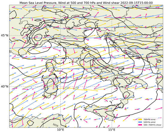 Figure 4 shows the geopotential heights at 500 and 700 hPa that remained nearly parallel over the western Mediterranean Sea, indicating minimal change in wind speed with height and resulting in weak vertical wind shear (Figure 4). This weak shear suggests a relatively stable stratification over the sea, which typically does not favor strong vertical mixing. However, as this flow approached Central Italy, the presence of the Apennine Mountains introduced substantial orographic effects. Over the mountainous terrain, the wind shear increased due to the curvature of isobars around the Apennines, causing variations in wind speed and direction that were more pronounced than over the adjacent western sea.