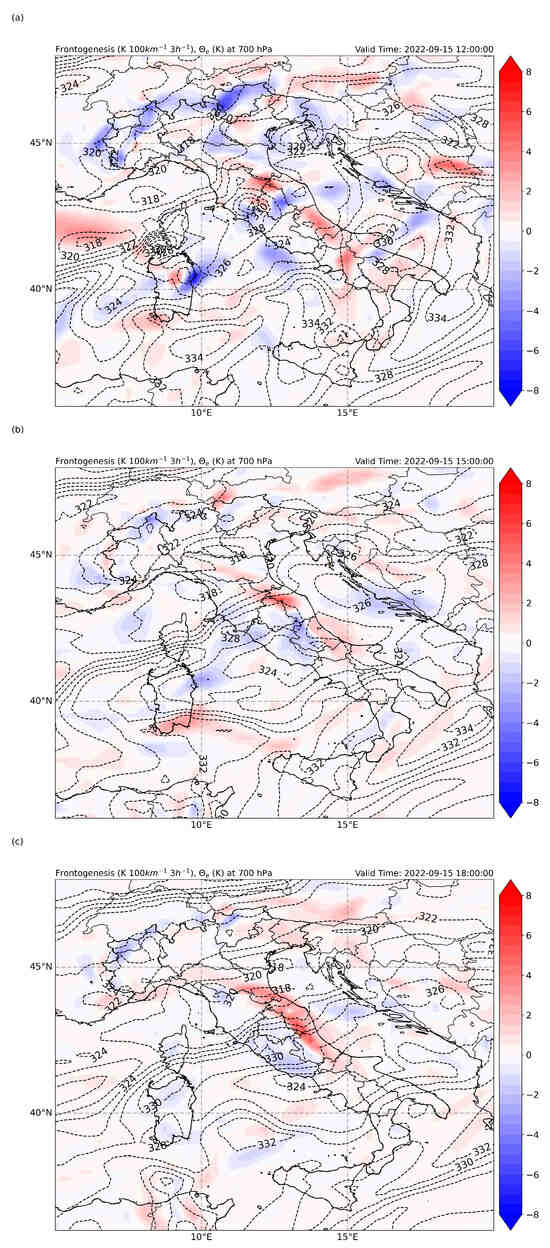At the synoptic scale, warm advection originating from the western part of northern Africa moved toward Italy. The mountainous terrain modified this warm air influx, reshaping the temperature gradient’s orientation and strength, effectively setting up conditions for frontogenesis.