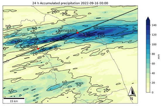 Accumulated rainfall over 24 h on 15 September 2022, from the WRF simulation at a 0.55 km × 0.55 km grid resolution. The gray lines denote the administrative boundaries. The locations of Cantiano and Senigallia are also shown. The cross-sectional analysis took place on the black line.