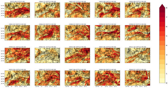 Figure 10 shows the 700 hPa geopotential height for all nineteen events, which have a more similar configuration to the event that occurred on 15 September 2022, together with the event itself, which is the first panel. The event from 6 July 1966 appears twice in Figure 10 for visual purposes. All the events clearly display a zonal flow. Not all the events present high values of specific humidity. The events that occurred on 31 January 2002 and 19 October 2011 had very low values of specific humidity at 850 hPa. Using an eyeball comparison, the event that occurred on 6 July 1966 exhibited a similar configuration of specific humidity to that of 15 September 2022, with the specific humidity filament extending from the southwest corner of North Africa toward Italy; however, the rainfall recorded at Arcevia, Frontone, and Cantiano was limited to 6.6 mm in 24 h. On 16 August 1963, there was another instance of zonal flow and water vapor transport. Arcevia, Frontone, and Cantiano recorded a rainfall of less than 5 mm in 24 h.