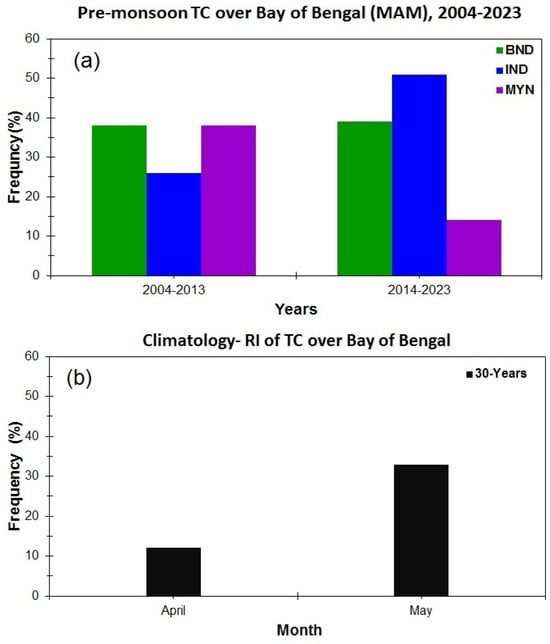 (a) Frequency of tropical cyclones (%) crossing different countries, viz. Bangladesh (green), India (blue), and Myanmar (purple), during the MAM season of 2004–2023. (b) Same as (a), but the climatology of rapid intensification of tropical cyclone cases from April to May derived from the Regional Specialized Meteorological Center (RSMC) for the tropical cyclones, IMD-New Delhi (https://rsmcnewdelhi.imd.gov.in/ accessed on 2 January 2025).