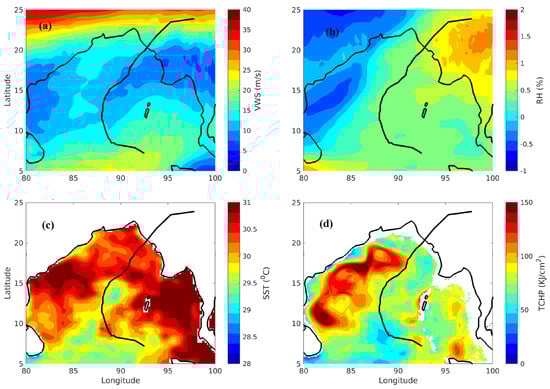 The Mocha cyclone made landfall on the North Myanmar–Southeast Bangladesh coasts between Kyaukpyu (Myanmar) and Cox’s Bazar (Bangladesh) on 06 UTC 14 May 2023, with sustained winds of approximately 210–220 km/h, equivalent to a category 4 hurricane intensity. Moreover, the Mocha cyclone brought approximately 64 cmd−1 of rainfall and an associated storm surge of 3–4 m near Kyaukpyu and Sittwe port city. However, for the Cyclone Mocha case, the SST was ~32 °C, and a TCHP > 100 KJ cm−2 caused the RI, and it lasted over 9–15 May 2023, as shown in Figure 3c,d. Correspondingly, the magnitude of VWS (ms−1) and RH (%) are shown in Figure 3a,b. In general, it was noticed that the VWS was relatively low, around 10 ms−1, and the RH > 50% during the genesis stage, valid on 00UTC 09 May 2023. However, Mocha intensified as an ESCS stage on 00 UTC of 13 May 2023, when the RH reached above 70% and the VWS reached 8 ms−1.