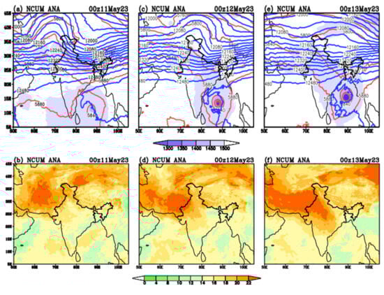 To understand the short-wave propagation due to the WD and the location of the vortex, a significant comparison of the geopotential height (GPH) field at different pressure levels is considered. Figure 4 shows the NCUM analysis of GPH (m) and temperature (°C) for the Mocha cyclone from 00 UTC from 11 to 13 May 2023. Mocha exhibited multiple curvatures starting from the genesis, intensification, and landfall period. Thus, Figure 4 in the upper panel represents the GPH field at 850 hPa (shaded), 500 hPa (contour; red), and 200 hPa (contour; blue) at different stages of Mocha. At 00 UTC of 11 May 2023, the GPH showed a weak vortex minimum GPH field at about 1450 m over the BoB located at 10° N; 88° E, whereas significant ridges and troughs persisted above 40° N over the Pakistan and Nepal region. On the next day, the ridges and troughs shifted towards the northeast direction, whereas the vortex intensified over the BoB at 11.0° N; 89.5° E, and the minimum GPH was about 1400 m, 4760 m, and 12,460 m at 850, 500, and 200 hPa levels respectively, as revealed in Figure 4c. Figure 4e represents the much intensified vortex Mocha that moved in a northerly direction, and the ridges and troughs over northern India were relatively weak and shifted in a further eastward direction. During 11–13 May 2023, initially, the GPH at 200 hPa was 12,500 m, later increasing to nearly 12,540 m over the BoB, and the direction of GPH was a north–south orientation, which eventually guided the Mocha cyclone towards the north-northeast direction (Figure 4e). Subsequently, Figure 4 (lower panel) depicts the temperature difference between 700 hPa and 500 hPa levels at 00 UTC of 11–13 May 2023. Since the Mocha cyclone has changed its track very efficiently, a simple and well-known method, such as the temperature difference between 700 hPa and 500 hPa levels, can be used for forecasting the direction of movement for tropical cyclones. This method has been well documented by Simpson [], and it is more appreciated and effective than the steering-level analyses thus adopted in this section.