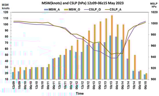 The NCUM-simulated mean sea level pressure (MSLP) and 10 m wind field of Cyclone Mocha, initialized at 00 UTC on 8 October 2013, are compared with IMD observations in Figure 5. To analyze the cyclone’s different stages and intensity, key parameters such as central sea level pressure (CSLP) and maximum sustained wind (MSW) during 9–15 May 2023 are examined and presented in Figure 5. The observations indicate that Mocha reached its lowest pressure of approximately 938 hPa and a peak MSW of 110 knots at 00 UTC on 14 May 2023. While the NCUM simulation underestimates the peak intensity of both CSLP and MSW, the overall pressure drop and evolution align well with IMD estimates. The SST near the cyclone’s center suggests that RI occurs when the SST exceeds 28.0 °C, accompanied by an average relative humidity of around 79% [].