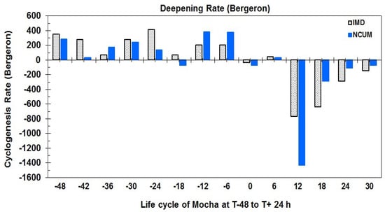 An explosively developing cyclone can dissipate within 24 h of its initial formation. Therefore, this study utilizes 12 h pressure changes to identify the most intense deepening phase of Cyclone Mocha. Following Yoshida and Asuma [] and Fu et al. [], the maximum cyclogenesis rates were calculated assuming 12 h pressure changes instead of 24 h as discussed in Equation (1). The RI in terms of the cyclogenesis of Mocha is calculated using the following definition as
