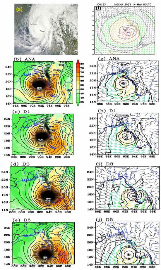 Cloud distributions derived from Aqua Tera satellite in (a) and wind flow pattern from CIRA observations in (f) during ESCS stage of Mocha valid on 00 UTC 14 May 2023. (b–e) MSLP (hPa) and perceptible water content (shaded; mm) derived from analysis, 24, 72, and 120 h lead forecast derived from NCUM operational model. Figure (g–j) is the same as (b–e), but for wind field (knots) at 12.5 km resolutions.