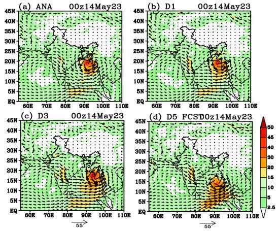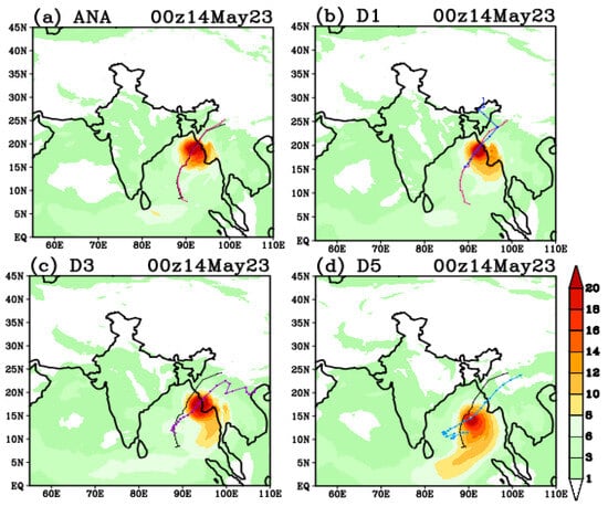 Subsequently, Figure 9a–d is the same as Figure 8 but for the wind field (shaded) and vorticity (contour; green) for the 200 hPa level. The westerly flow patterns were significantly noticed above 20.0° N and the ridge over the Tibetan Plateau. The maximum wind speed of 80 ms−1 along with positive vorticity (~5) was significantly confined at 100° E and further extended in an eastward direction. The wind speed and direction in the 24-, 72-, and 120 hrs forecasts (Figure 9b–d) and vorticity field are closely resemble the analysis at the 200 hPa level, as shown in Figure 9a. The positive vorticity (green contour) play vital role for the eastward movement of the Mocha storms from BoB to Myanmar coast.