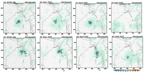 Same as Figure 11, but for steering flow derived from NCUM (a) analysis, (b) 24-, (c) 72-, and (d) 120- h forecasts valid on 00 UTC 13 May 2024; (e–h) same as (a–d), but valid on 00 UTC 14 May 2024.