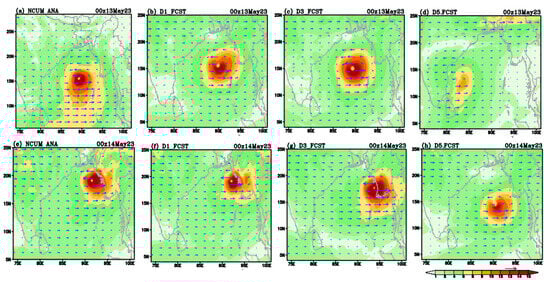 Figure 12a–h represent the SF valid on 00 UTC of 13 (upper) and 14 May 2023 (lower panel). The upper panel of Figure 12a–d shows the SF of Mocha when it was in the VSCS stage, valid on 00 UTC of 13 May 2023. Figure 12a clearly shows the well-organized and intense eastward SF and a maximum intensity of 15 ms−1 in the NCUM model analysis. Similarly, the 24, 72, and 120 h NCUM forecasts of SF (Figure 12b–d) reasonably agree with the analysis (Figure 12a). One can notice that the SF features in the 24 and 72 h forecasts valid on 00 UTC 14 May 2023 well agree with the NCUM analysis. In contrast, the 120 h forecast predicts the SF at Tamilnadu coast (Figure 12d), far away from the vortex position as shown in the INSAT-3D satellite (Figure 2). The location and intensity of SF significantly deviated in the 120 h forecast (Figure 12 h) valid on 00 UTC 14 May 2023. The eyewall structure is clearly represented in the 24 and 48 h forecasts, as compared to the 120 h forecasts.