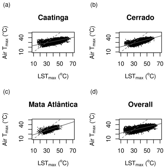 Scatterplots comparing the observed daily maximum air temperature () from INMET weather stations with corresponding maximum LST from the MODIS/Aqua MYD21A1D product. Results are shown for the biomes: (a) Caatinga, (b) Cerrado, (c) Mata Atlântica, and (d) all biomes combined. Each panel includes a gray solid line representing the regression model and a gray dashed line indicating the line of equality (1:1), where satellite LST and observed air temperature would be equal. These plots illustrate the strength and variation of the relationship between surface and air temperatures.