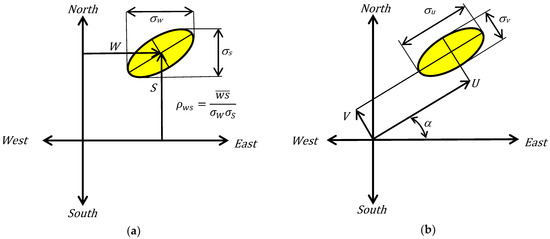 There are two alternative forms of OEN parameterization: Crutcher’s zonal–meridional axes shown in Figure 1a; and Harris’ ellipse axes shown in Figure 1b. The ellipses represent the one standard deviation contour of the joint probability density (jPDF). The Harris axes are rotated by angle, , to align with the principal axes of each ellipse.