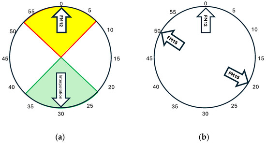 Example regularization of observation times, where the specified report types and observation minutes are indicated by the arrows and the allowable reporting dither by the colored zones: (a) FM-12 observations with optional interpolation to two observations per hour are regularized by rounding reporting dither within ±7.5 min to the hour and half-hour; (b) The FM-12 observation time on the hour is moved to the nearest FM-15 time. Duplications are resolved by the priority order of the specified types to be kept, while other unspecified report types (e.g., FM-16 SPECI) are excluded.