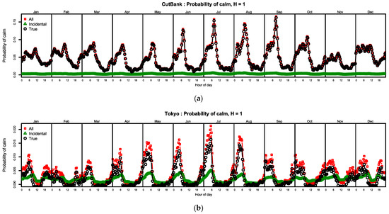 Frequencies of all, incidental and true calms at: (a) Cut Bank, MT, USA; (b) Tokyo, Japan.