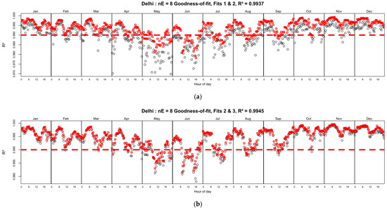 Figure 5 shows how the fit for Delhi improves through the fitting stages in terms of . In (a), the black circles are the first-stage values, and the red squares are the improved second-stage values. In (b), the black circles are the second-stage values, and the red squares are the improved third-stage values. The improvement in is modest overall but is largely by improving the poorest fits. The incidence of out-of-bound values decreases through each stage. The fits for this location are poorest at the start of the summer monsoon, May–June, and indicate variability in the date of onset.
