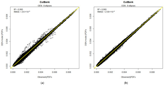QQ plots of observed and OEN model jPDFs for 8 ellipses at Cut Bank, MT, USA: (a) OEN model; (b) OSN model. The points are values of (kn−2) evaluated at 1 kn intervals for all MH. The thick yellow line represents 1:1 correspondence.