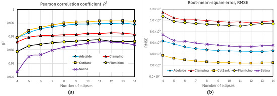 Sensitivity of OEN mixture model to number of fitted ellipses: (a) Pearson correlation coefficient, ; (b) Root-mean-square error, RMSE.