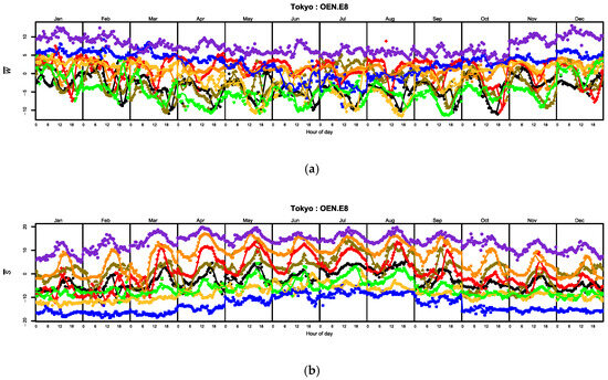 Figure 9 demonstrates the effectiveness of the unsupervised threading process in resolving the mean zonal–meridional components, and . Tokyo was chosen as the example for the strong sea/land breeze diurnal oscillations and the seasonal changes between the summer and winter monsoon, which are gradual at the winter–summer change but abrupt at the summer–winter change (October–November). The color key indexing individual ellipses is used consistently in reporting this study.