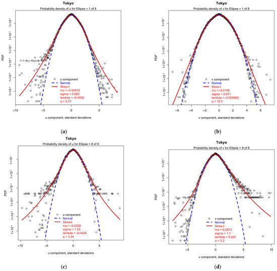 Figure 10 presents the PDFs of the demodulated and for all MH from the eight-ellipse OEN model for Tokyo: (a, b) of the most dominant ellipse 1; and (c, d) of the least dominant ellipse 8. Observations are reasonably normal over 3 orders of magnitude (OM) for ellipse 1, but only 2 OM for ellipse 8. Further into the tails the observations deviate above normal. As all the other stations show the same trends, the question arises as to whether this indicates deficiencies in the OEN model or in the demodulation process.