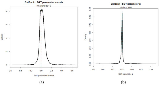 KDE PDFs of the bivariate Skew-t parameters for all 8 ellipses and MH at Cut Bank, MT, USA: (a) Parameter lambda, , for skew; (b) Parameter , for excess kurtosis. Dashed red lines indicate initial OEN values.