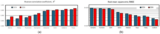 Goodness-of-fit of OEN and OSN models for 8 ellipses: (a) Pearson correlation coefficient, ; (b) Root-mean-square error, RMSE.